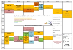 - Ab Montag, dem 04.05.2026 findet statt Fitness Yoga (19-20h) ein Slider-Training (19-20h) mit Britta statt.